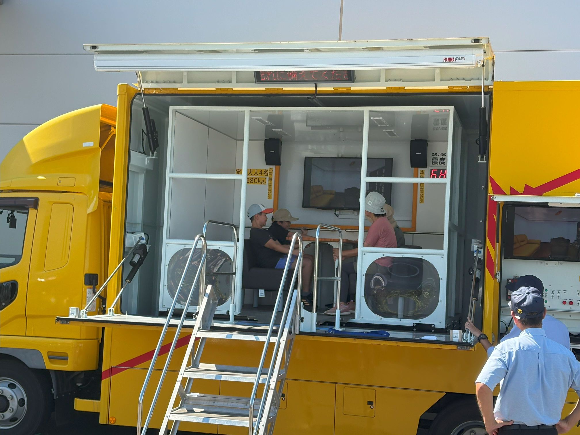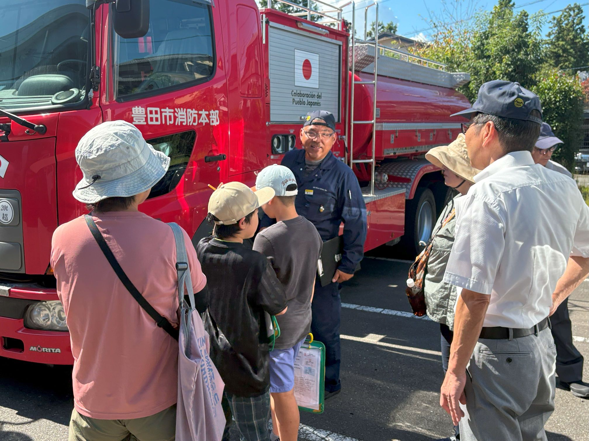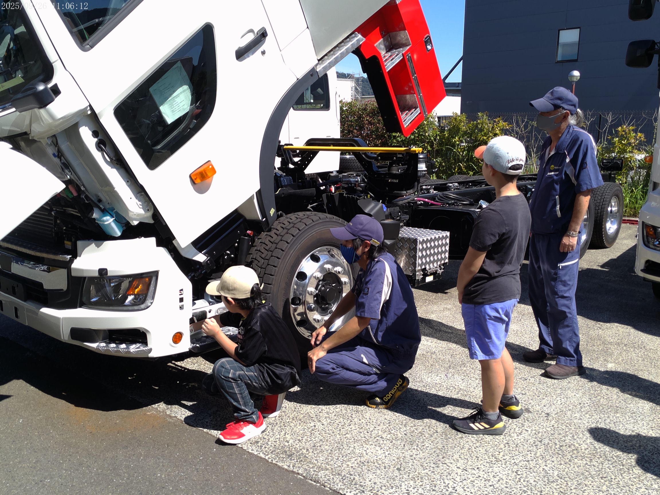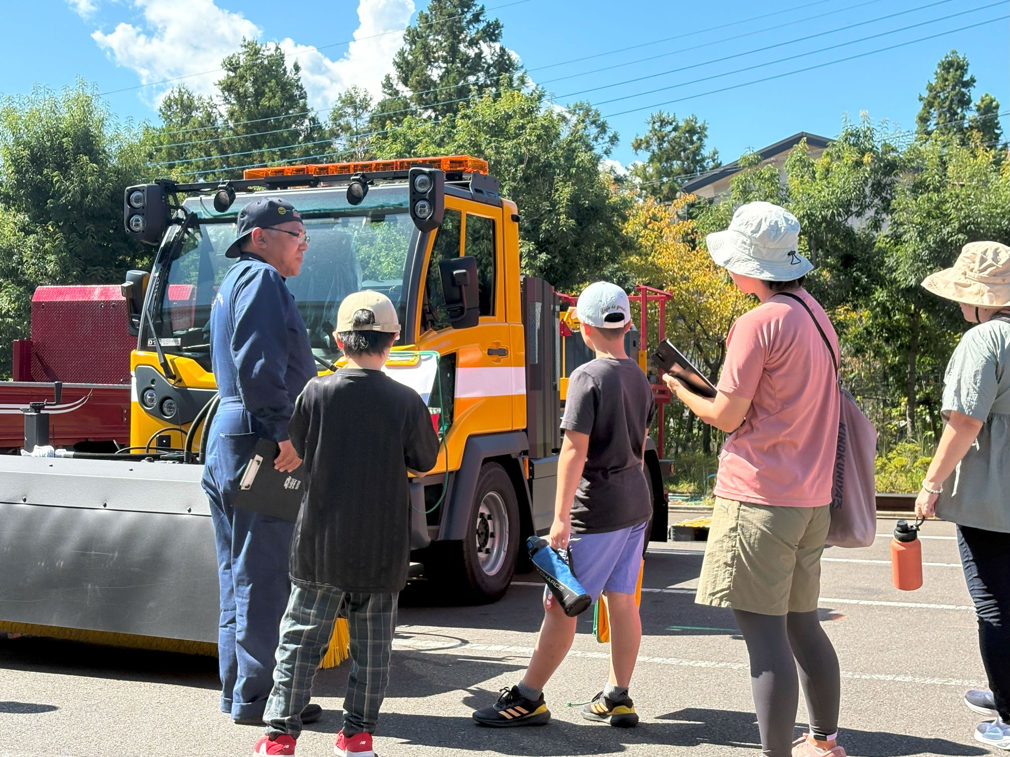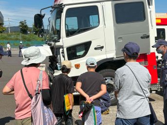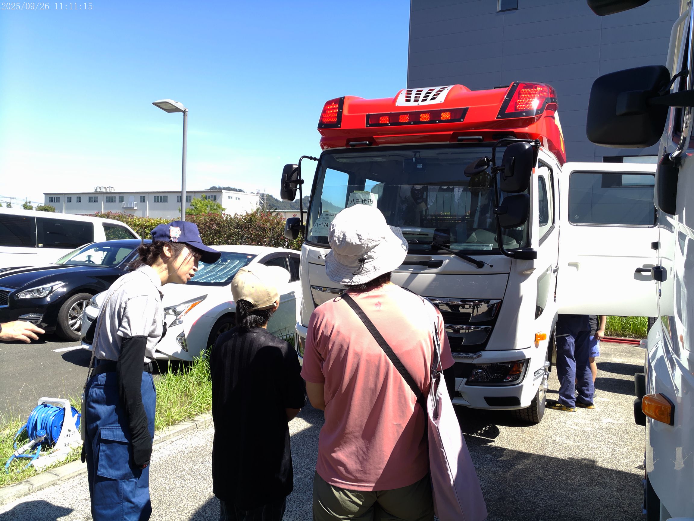 飛鳥車体のエリアで製作中の消防車の説明や、実際にサイレンの音を間近で体感。