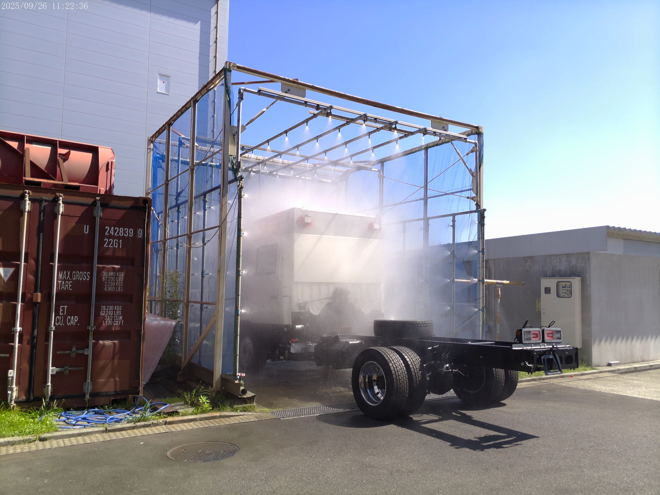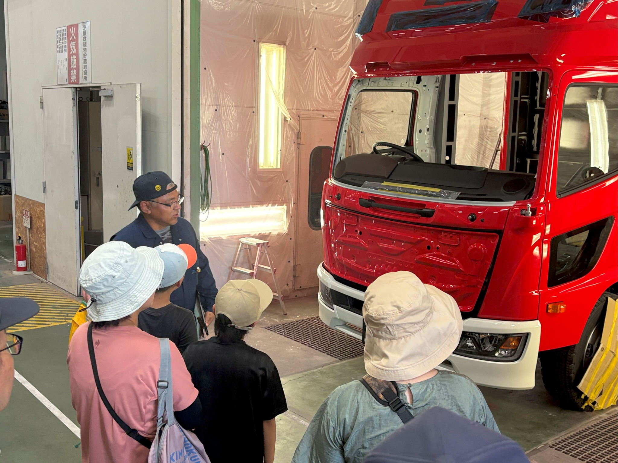 飛鳥特装のエリアで製作している特殊車両の説明や、塗装ブースを見学。